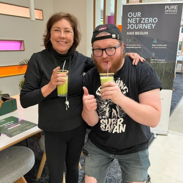 Glyn & Jordan from Transatlantic Shipping, enjoying their green smoothies at Pure Offices in Nottingham.